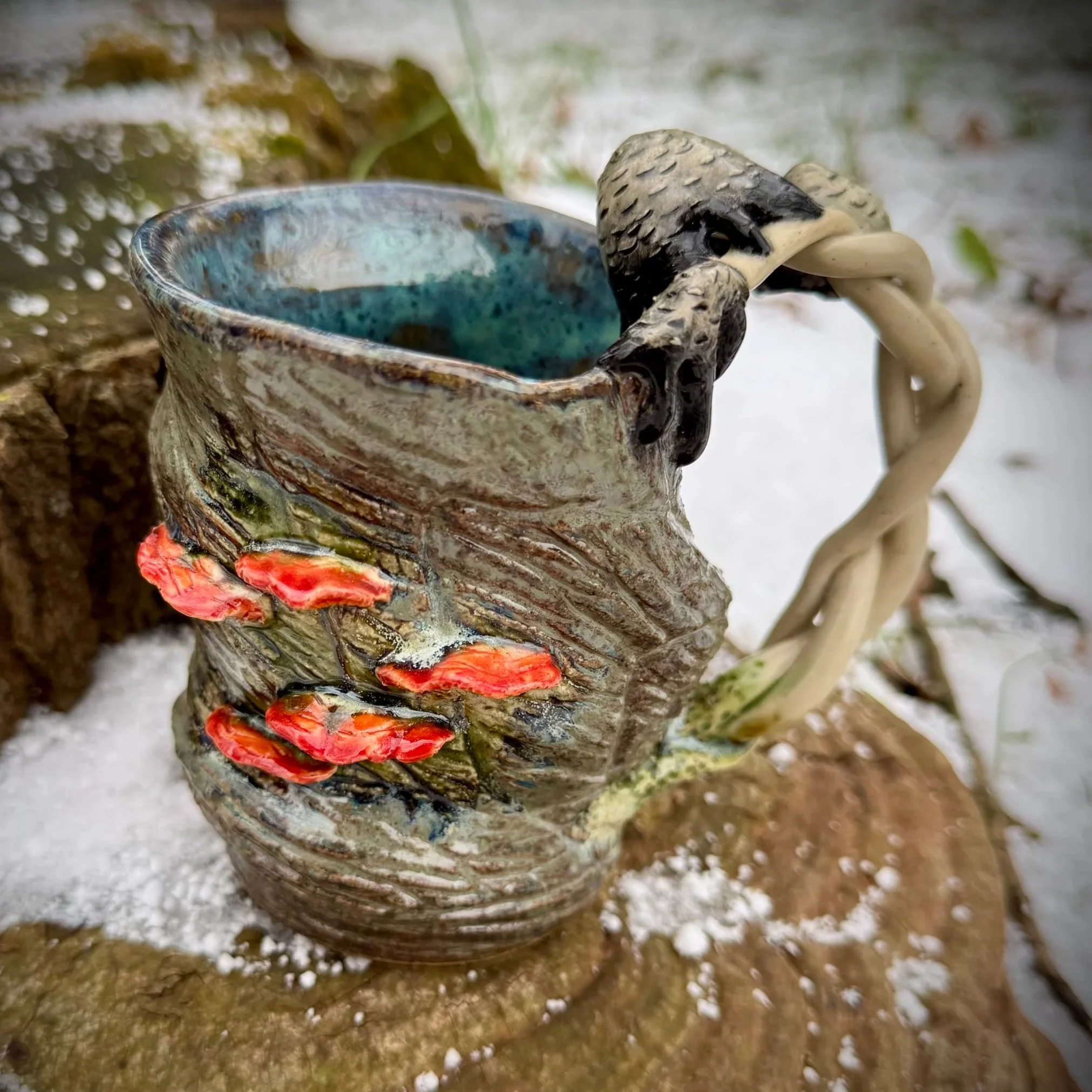 Each piece is one-of-a-kind and sculpted entirely by hand. Some begin as wheel-thrown forms, others as hand-built slabs. Textures are carved individually, mushrooms are sculpted and attached, and surfaces are layered with multiple glazes to create forest-floor depth. Each piece is fired twice and finished with careful documentation and packaging. A single mug can take many hours across several stages.